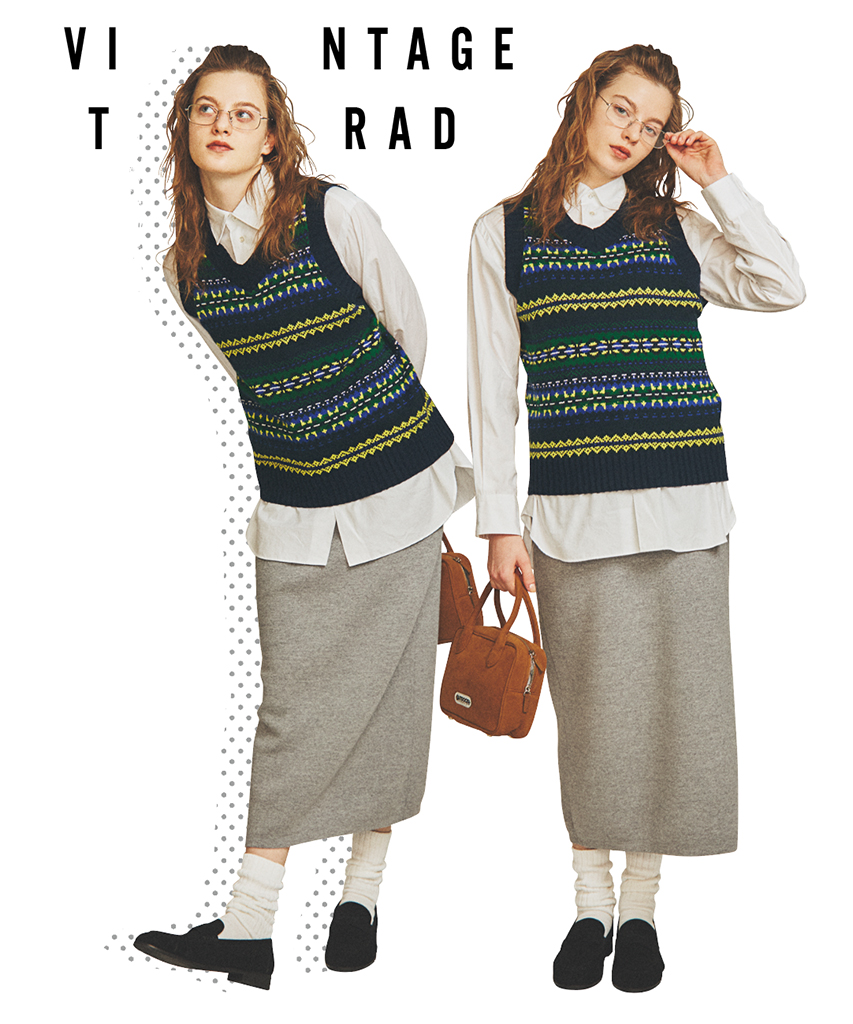 コンパクトなベストでスマートさを保ちつつ、鮮やかな柄で個性をプラス。ベストの主張が強いぶん、くしゅくしゅとたるませた白ソックスやリムレスの眼鏡など、細部まで丁寧にレトロムード。