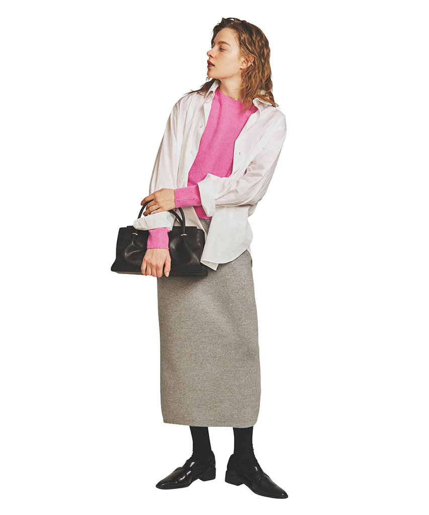 キレのあるパリッとした質感の白シャツと、きめ細かな編み地のニットスカート。アレンジが効く大きめサイズのシャツにメリハリをつけるように、スカートはIラインを選択。