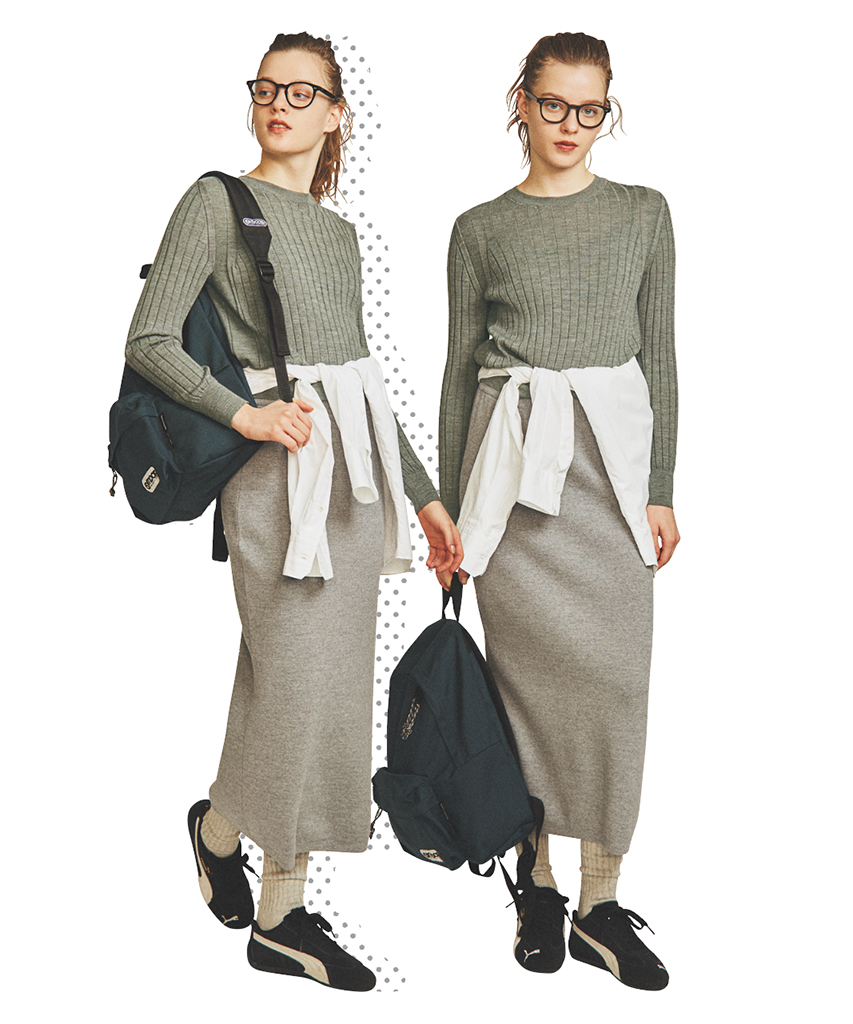 腰に巻いた白シャツとグレーニットスカートは着まわし。ニット 32,400円/SLOANE(ザ ショップ スローン 新静岡セノバ店) 眼鏡 54,780円/Oliver Peoples(ルックスオティカジャパン カスタマーサービス) リュック 6,380円/OUTDOOR PRODUCTS(OUTDOOR PRODUCTS カスタマーセンター) ソックス 1,210円/靴下屋(タビオ) スニーカー 15,400円/プーマ(プーマ お客様サービス)