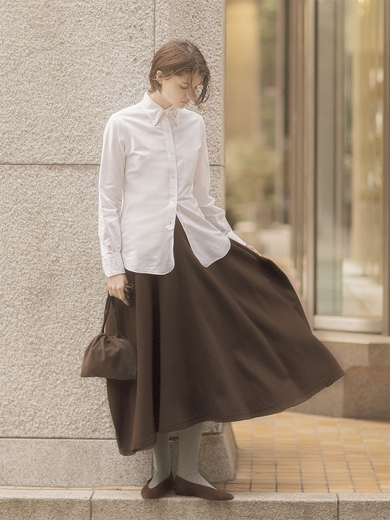 「ゆれ広がる」というより、「ふくらむ」ようなフレアスカート。ふっくらとした上質ウールが、トップスは普通でも品や華やぎにつながる構築的なシルエットを維持。軽く、さっぱりとしたトップスが多くなるこれからは、流れのいいシルエットよりも絵になる存在感や華奢に見えるギャップ、上下の重心バランスが簡単に整う重みスカートが好都合。