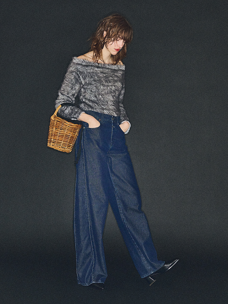 ダークブルーデニムパンツ 52,800円/CLOSED(トヨダトレーディング プレスルーム) グレーフェイクファークロップトニット 9,460円/MOUSSY(バロックジャパンリミテッド) 黒フープピアス 10,800円/アビステ かごバッグ 8,250円/Marie-Louise(ラヤン) ショートブーツ 58,300円/TSURU By MARIKO OIKAWA