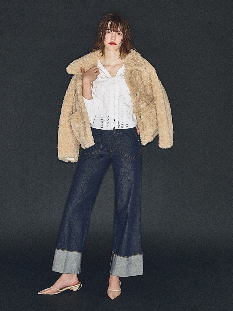 ブルーロールアップデニムパンツ 30,000円/シーニュ ベージュボアジャケット 53,900円/JAKKE(ジャック・オブ・オール・トレーズ プレスルーム) 白ブラウス 64,900円/マーレット(LITTLE LEAGUE INC.) パンプス 53,900円/コルコバード(フィルム)