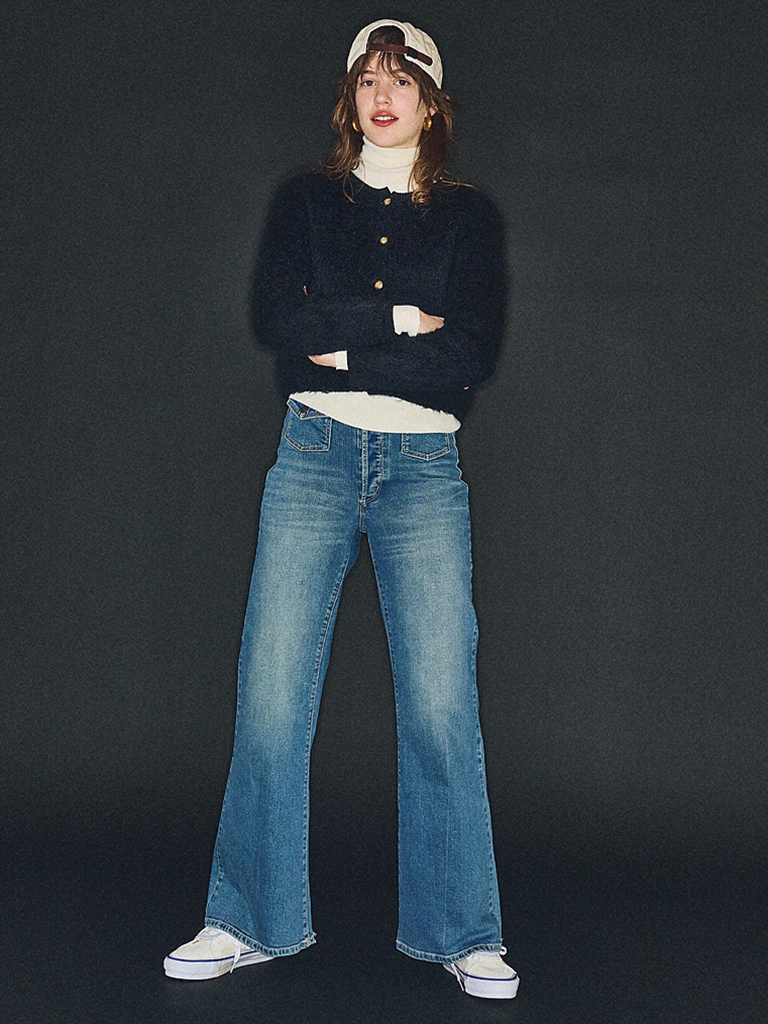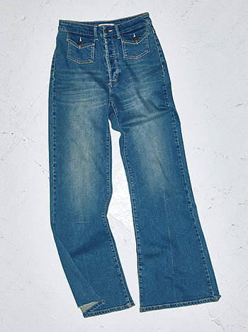 穿き込んだような味わいのあるブルーデニム。ハイウエスト+微フレアの脚が長く・細く見える美脚シルエット。古着ほどくたっとせずシルエットがキレイに出てくれるから、レッグラインもまっ直ぐに。わずかにすれたようなひかえめなダメージ加工に留めることで、キレイな印象を保って使える。