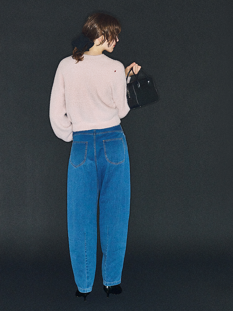 ブルーバルーンデニムパンツ 24,200円/Liesse ピンクシャギーニット 31,900円/ソブ(フィルム) 黒シュシュ 3,520円/Jilky シルバーイヤリング 41,800円/NINA&JULES(ショールーム ロイト) 黒バッグ 68,200円/メゾン カナウ(ヤマニ) ショートブーツ 9,990円/MANGO