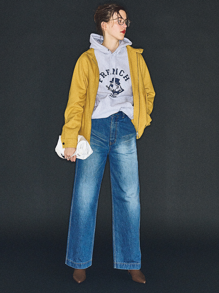 インディゴカーブラインデニムパンツ 46,200円/ダブルスタンダードクロージング(フィルム) イエロージャケット 50,600円/KHONOROGICA(HEMT PR) グレーパーカ 28,600円/ソルト(プルミエ アロンディスモン) 眼鏡 26,950円/Polo Ralph Lauren(ルックスオティカジャパン カスタマーサービス) ペーパーロールバッグ 3,300円/GBH ショートブーツ 18,260円/SLOBE IENA(SLOBE IENA 自由が丘店)