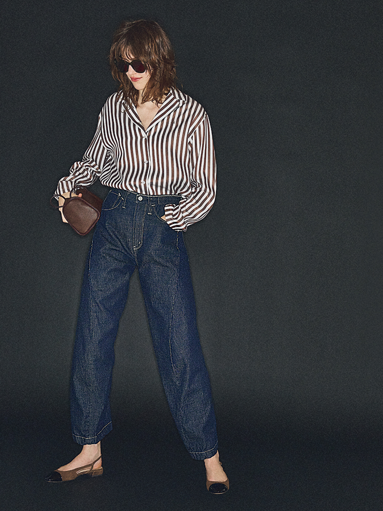 インディゴデニムのきちんと感は保ちつつ、すそのトーンが明るくなることで重みをカット。筒太な形をキープしてくれて、均整のとれたいでたちに。すその浅い色みを引き継ぐように、ヌーディなパンプスを合わせて一体感を強化。ハリのあるツヤやかな素材が装いの上品さを助長。