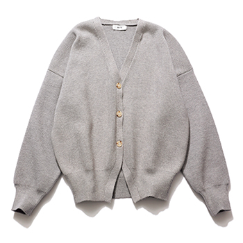 ライトグレーカーディガン 16,500円/AKTE 肩ひじ張らずに着られる、なだらかなドロップショルダー。ふっくらとしたボリュームスリーブがアクセントに。3つボタンによるすその逆Vで生地の重みをカット。