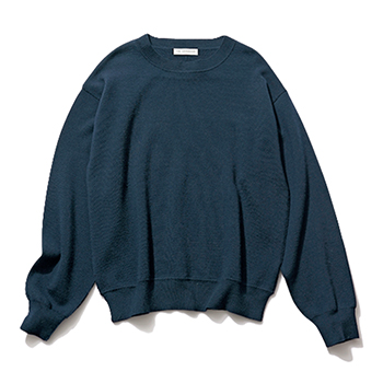 ネイビークルーネックニット 29,700円/THE SHINZONE(Shinzone ルミネ新宿店) 素材のよさとリッチな厚みによって、正統派なネイビーがますます知的に。スウェットのように、編み地の目立たない質感とすぼまるすそでボトムとのバランスもよく。