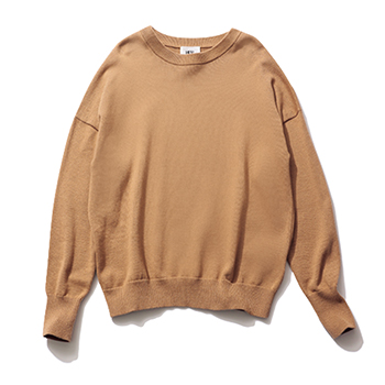 キャメルクルーネックニット 27,500円/HER. 穏やかなキャメルカラー。そでは長めの設計で、たるませて着ると手元に洒脱なニュアンスが加わる。ブラウンよりも淡く、ベージュよりもはっきりするキャメルの色みがゆるいニットには好都合。