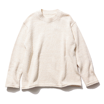 ざっくりとした厚手の生地に、ゆとりを持たせた大きな身幅。ドライなオーバーニットは、リアルタイムに見合ったぬくもりを補いながら、装いに抑揚を添えてくれる。