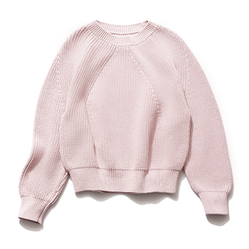ピンクケーブルニット 30,800円/バトナー(BATONER) ニットのかわいた風合いによって、かわいいピンクが大人でも試しやすい微糖に変化。くたっとしない、しっかりとした厚手生地。