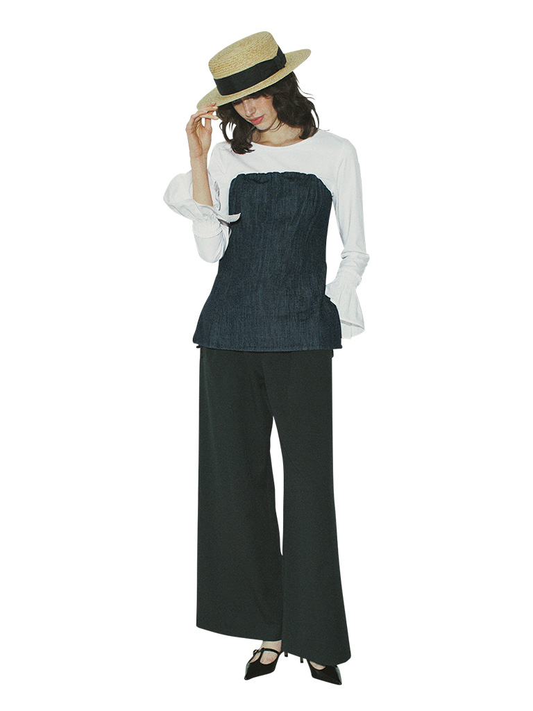 【POINT】単にキレイなだけで終わらない、洒落っ気につながる服未満のデニムの意外性。すらりとしたパンツと合わせて胸元からつながりよく脚長に。