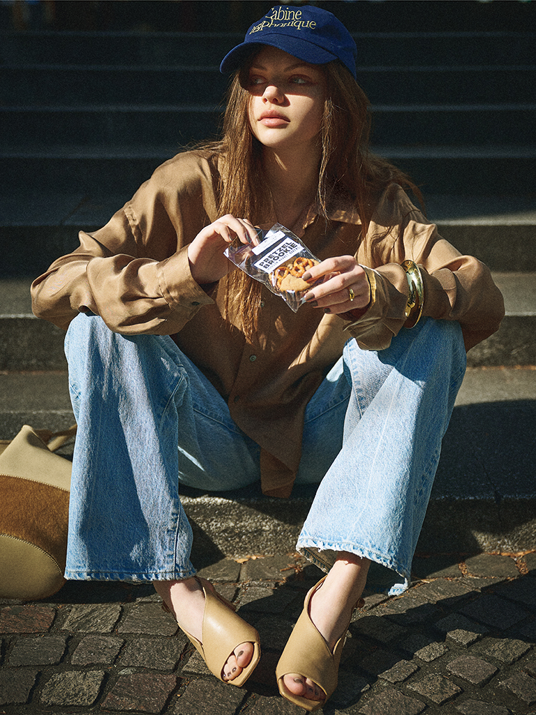 白からベージュにかえて、シャツ+デニムのメンズっぽさにやわらかさをカバー。光沢素材ならではのニュアンスで、間違いないベージュとデニムを更なる高みへ。