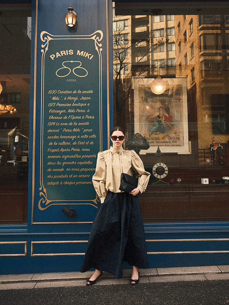 リラックスしたオーバーサイズのシルエットが、ベージュの持つ柔らかさと相まって、着るだけでこなれたムードに。とろみのある生地による自然なドレープが、動くたびに表情を変え、シンプルな着こなしにも奥行きが生まれる。