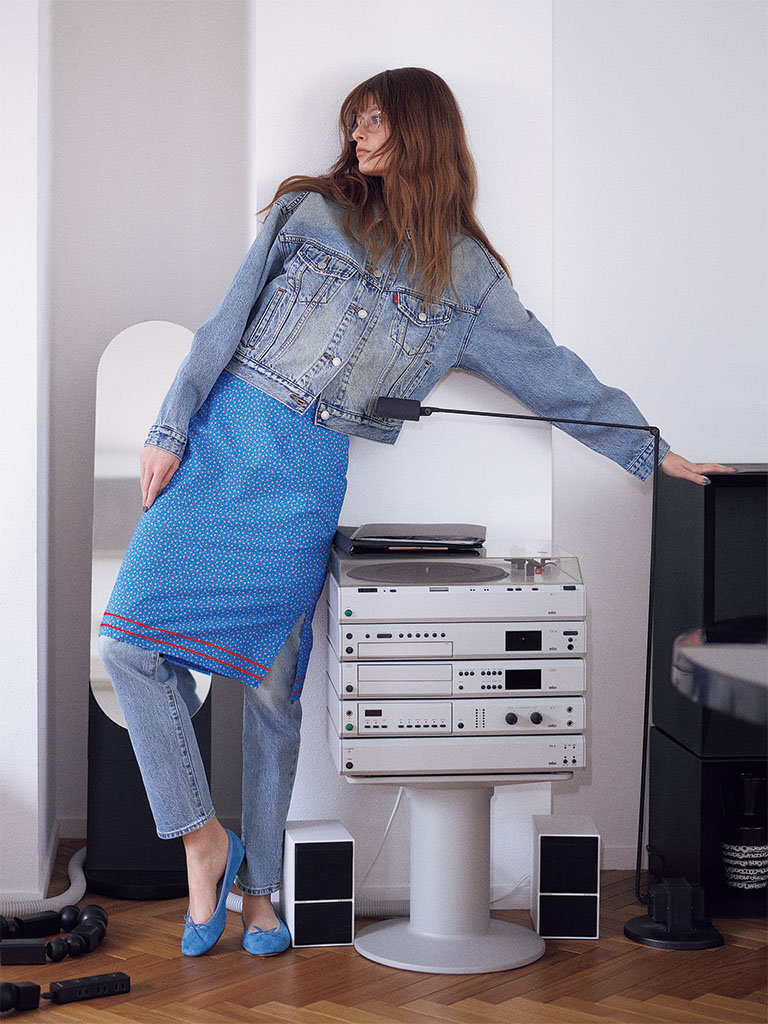 【POINT】あせたブルーによく似合う古着みたいなスカートでデニムONデニムをブラッシュアップ。ヴィンテージライクなムードでまとめながら、ラフに逃げず「デニムでオシャレ」に。