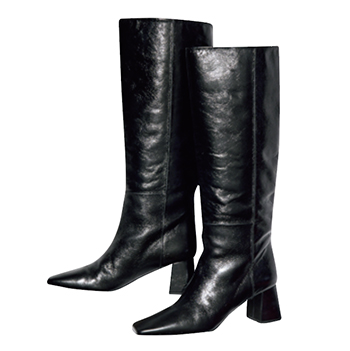 黒ロングブーツ 110,000円/ダブルスタンダードクロージング(フィルム) ボトムをインしやすい太めの筒をセレクトして、アレンジの幅を広げて。