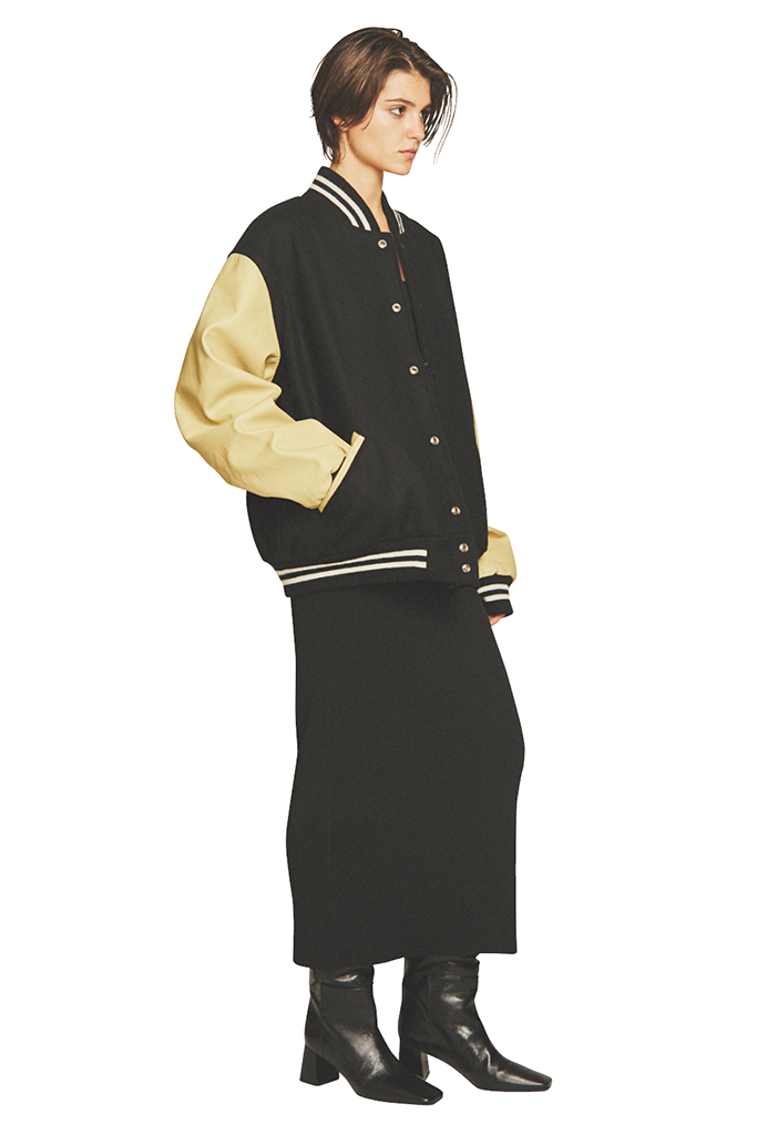 ロングブーツなら、歩いたり座ったりしても足首がのぞく心配とは無縁。筒まわりが細いから細身のスカートと合わせたときもあたりが出にくい。すっきりとまとめたミニマルな黒でぶかっとしたブルゾンとのコントラストも強まって、大人っぽさと着映えを両得。