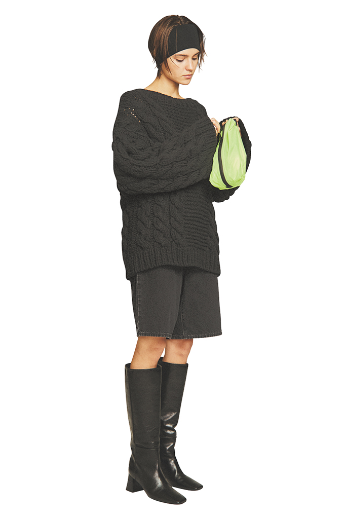 潔くワントーンでまとめてなじませたのも、ミニの幼さが浮かないポイント。そのぶんあえて素肌をのぞかせて、メリハリよく。あたたかみはボリューミィなニットで補って。