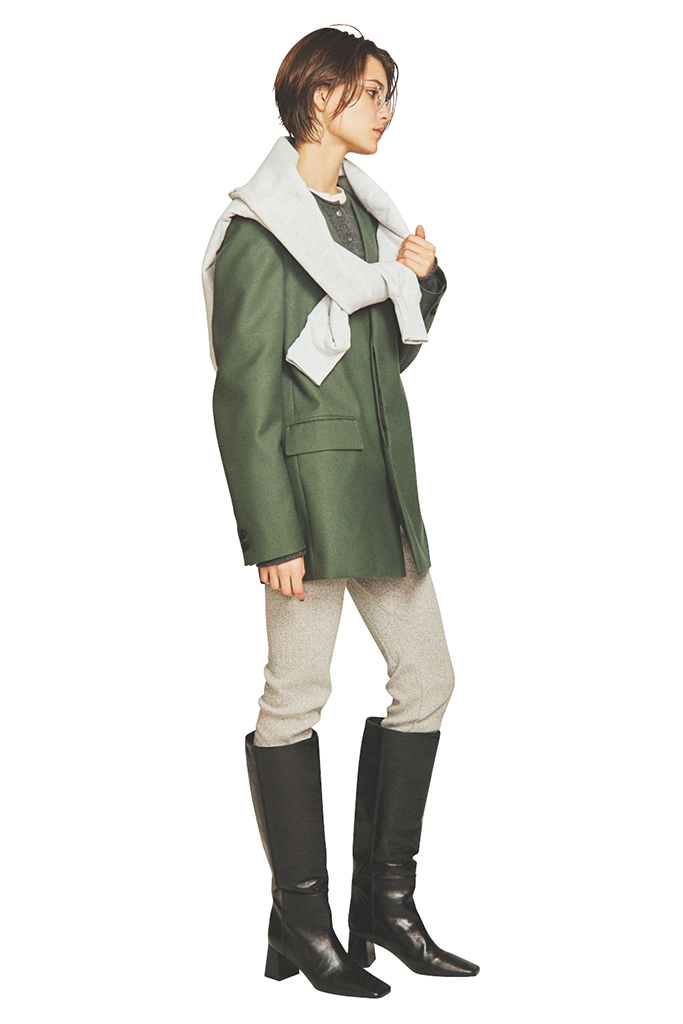 シャツやジャケット、プリーツスカートなど、クラシカルなスタイルをほぐす役割として渋いレトロな配色に。それらをまとまりよく仕上げるのもきりっと見せるロングブーツならでは。