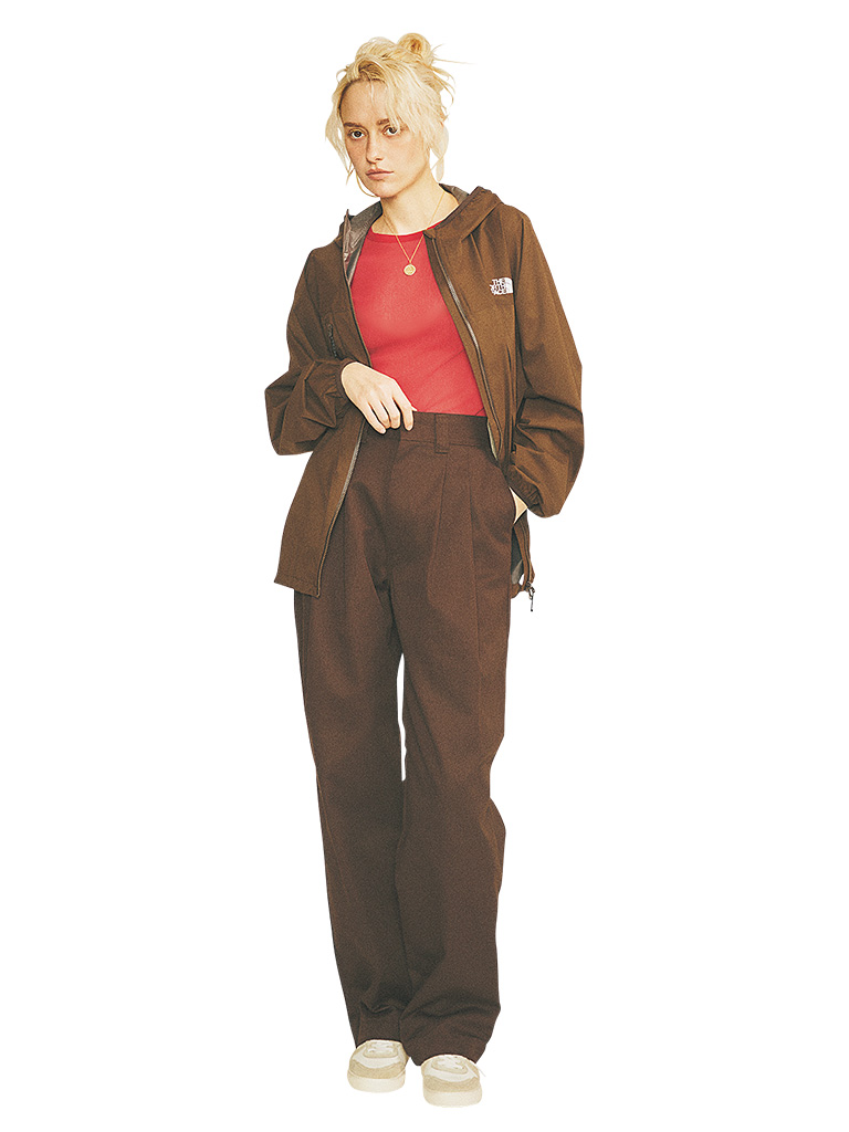 【POINT】濃度を上げた暖色どうしで、スポーティな装いを大人っぽく。過ごしやすいアイテムだけでも、穏やかな品のよさをまとえるのも濃ブラウンの魅力。隙間からのぞく程度に効かせたシアーな赤Tが、色気をひとさじ。