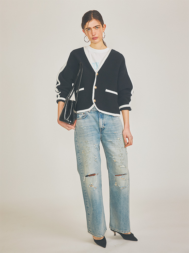 【POINT】ボーイッシュなデニムに気品を宿すツイード調の端正なネイビー。短めの丈感だから、さっと羽織っただけでも脚長に。