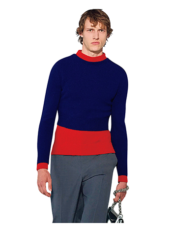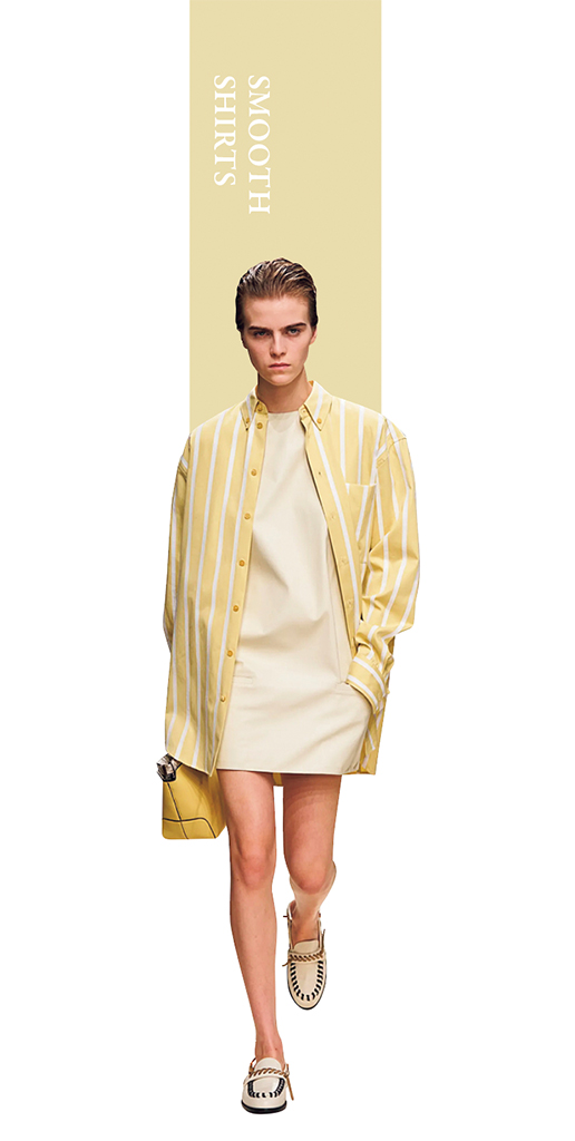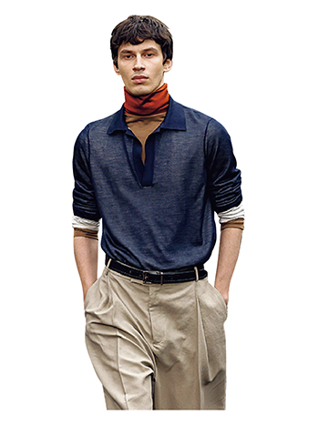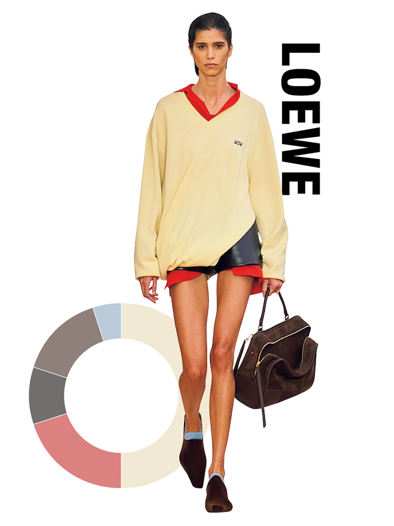 前任者のクリエーションを引き継ぎながら、スポーティなリアルクローズが展開された新生ロエベ。赤のポロえりや、ブルーのくるぶしソックスで、温和なイエローをエネルギッシュな面持ちに。