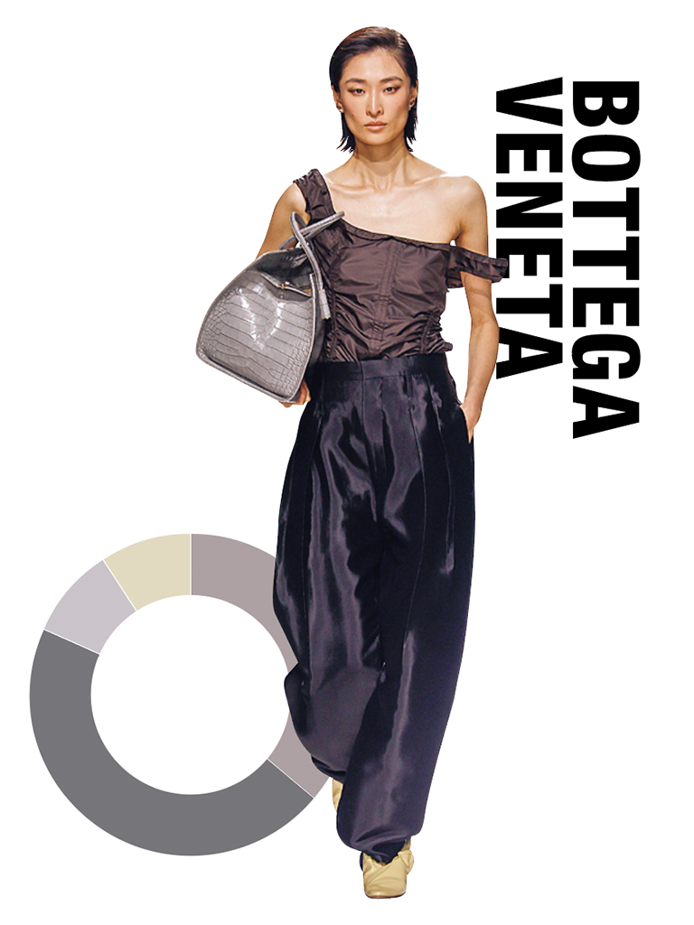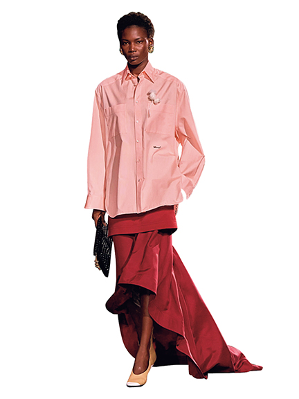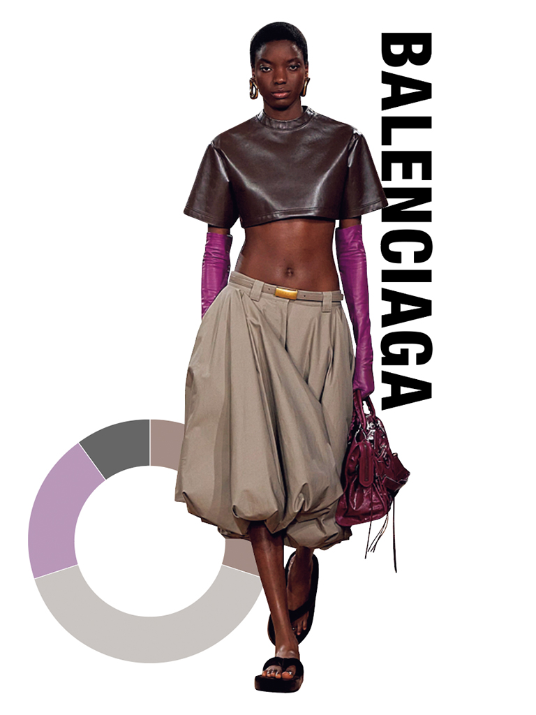 ストリートを得意としてきたバレンシアガには、ややエレガントな波が到来。ブラウンのレザートップスやトングサンダルで辛口に見せつつ、彫刻的なスカートやパープルの小物で行儀よく。