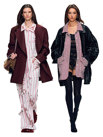 ルックではパジャマのようなシャツを多用。リュクスなボルドーでラフな女っぽさを体現。