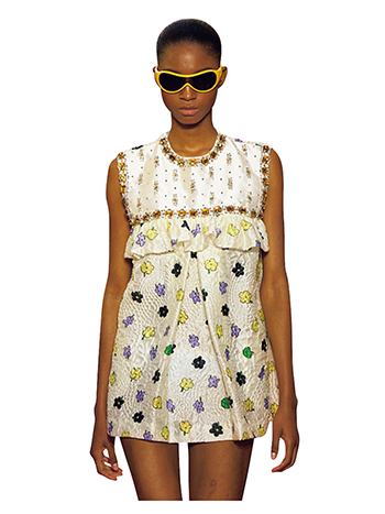 光沢のある白地に、手で描いたような花をちりばめたデザイン。黒やイエロー、パープルなど、花柄らしからぬポップな色合わせが新鮮。花柄にフォーカスしたブランドは、そのほかにも多数。タイムレスに支持されてきた柄ながら、今まで以上に盛り上がりを見せるシーズンになりそう。