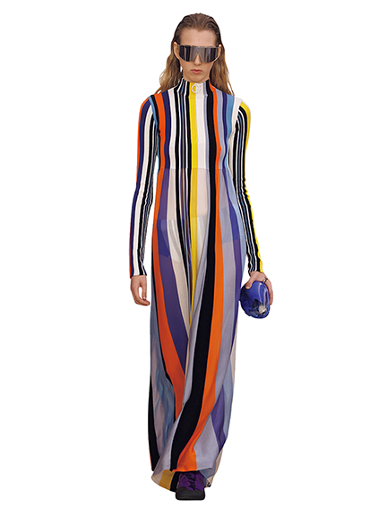 10年以上ブランドを支えたクリエイティブディレクターの退任後、初めて迎えたコレクションはフレッシュな色彩で幕開け。ルーツであるスペインの情熱性を思わせるしま模様は、歩くたびになびくシアーな生地で、鮮烈なのに力みがなくのびやか。