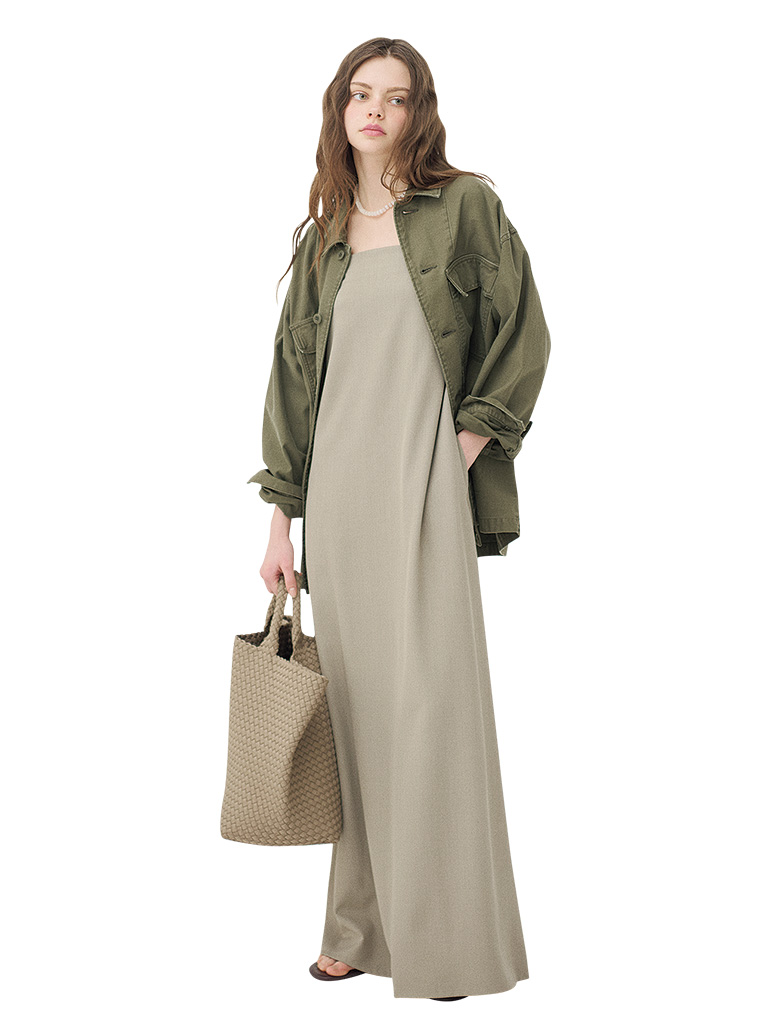 【POINT】華奢なデコルテやドレスのしなやかな落ち感でクールなだけじゃない繊細な女性らしさを表現。体が泳ぐオーバーサイズのミリタリージャケットにより、ベアトップワンピースのミニマルさが引き立つ結果に。