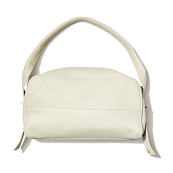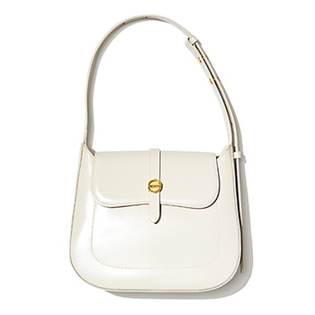白バッグ (20×23×7) 41,800円/LEMEME カウレザーを使用したショルダーバッグ。光沢もあるクリーミーな白に、シーリングスタンプをモチーフにしたバックルを合わせてレトロなムードを助長。マチも広く、見た目以上に収納力が高い。