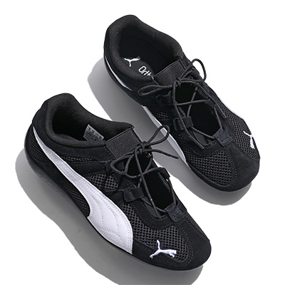 黒レースアップスニーカー 13,200円/プーマ(プーマ お客様サービス) 人気の薄底スニーカーをメッシュアッパーで快適に。靴下で遊べる、甲が開いた形かつレースアップフォルム。