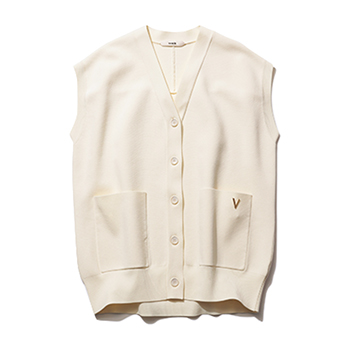 ニットベスト 26,400円/venit(ハルミ ショールーム) 硬さのある生地とゆとりのある長め丈で、ノースリでも端正。左ポケットのゴールドがアクセントに。
