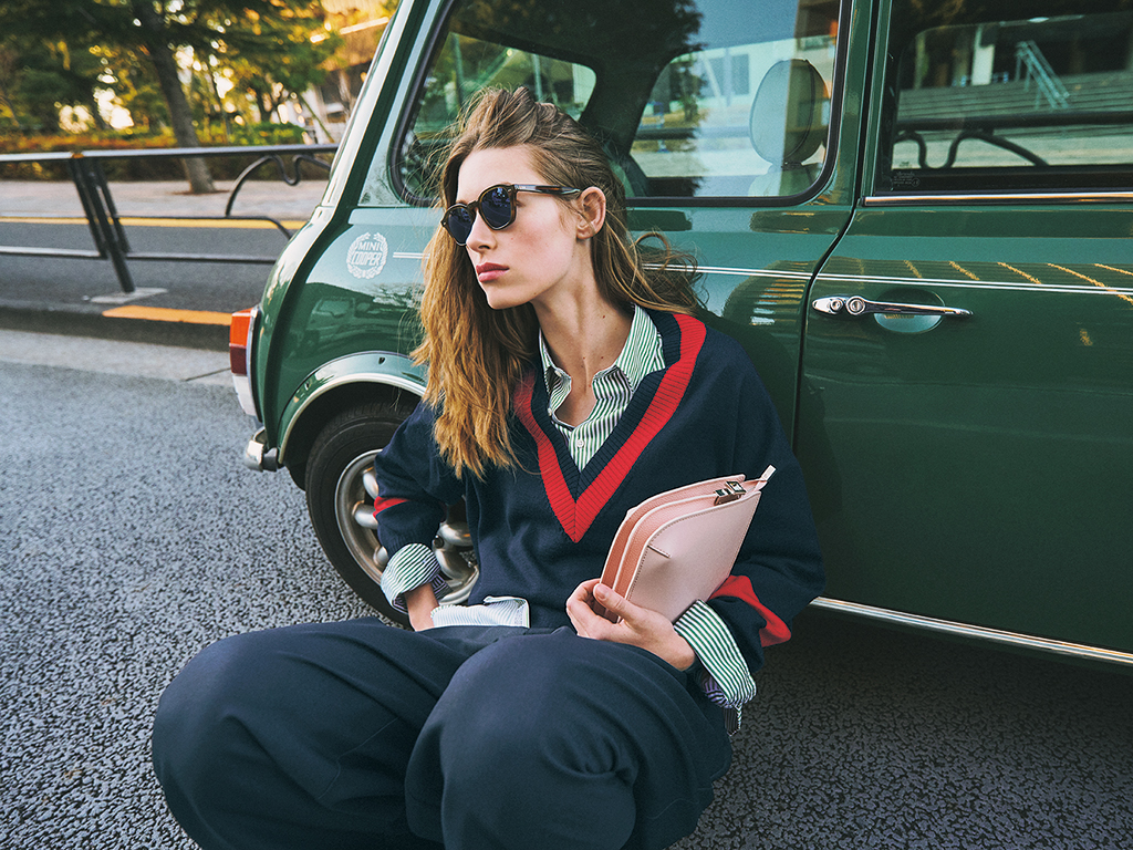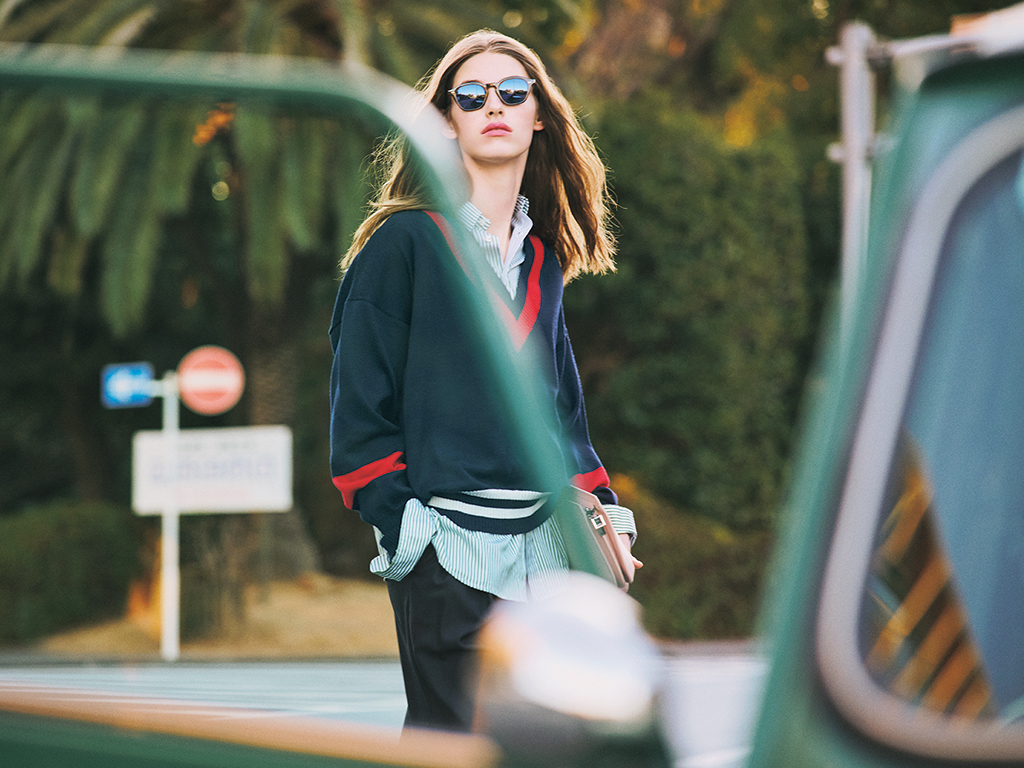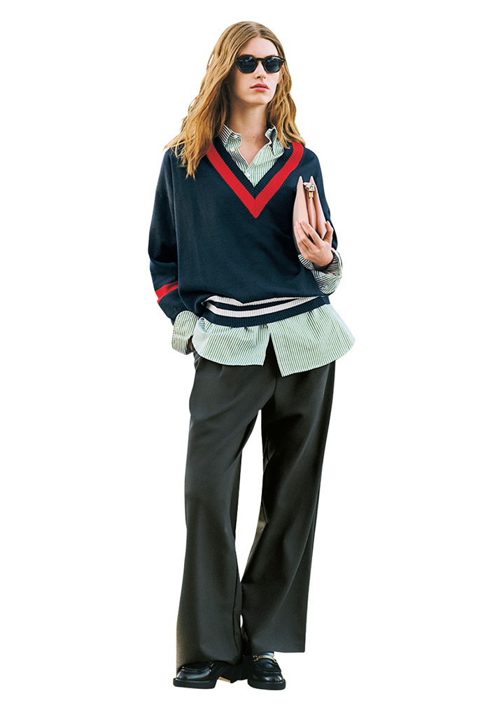 ネイビーチルデンニット 48,400円/トリコデパパ(ジャック・オブ・オール・トレーズ プレスルーム) 中に着たシャツ 45,100円/INDIVIDUALIZED SHIRTS (メイデン・カンバニー) パンツ 17,600円/AKTE サングラス 58,300円/オリバーピープルズ(ルックスオティカジャパン カスタマーサービス) バッグ 16,500円/アンタイトル ローファー 20,350円/ダイアナ(ダイアナ 銀座本店) シャープな首まわりに沿う、赤ラインとのダブルVでメリハリよく。