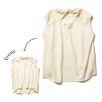 ノースリニット 30,800円/エストネーション 肩まわりの部分的なサテン生地が、ソフトなニットのレディ度をアップ。首元のねじれも甘さを生むギミックに。