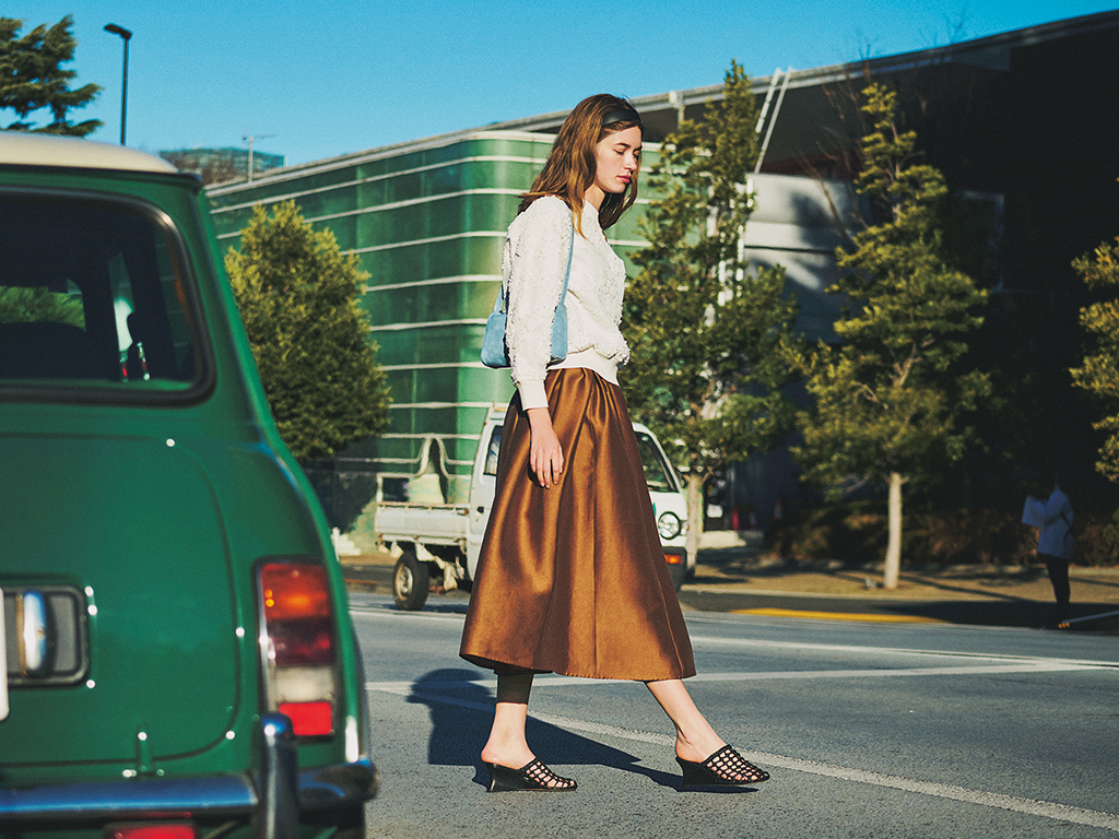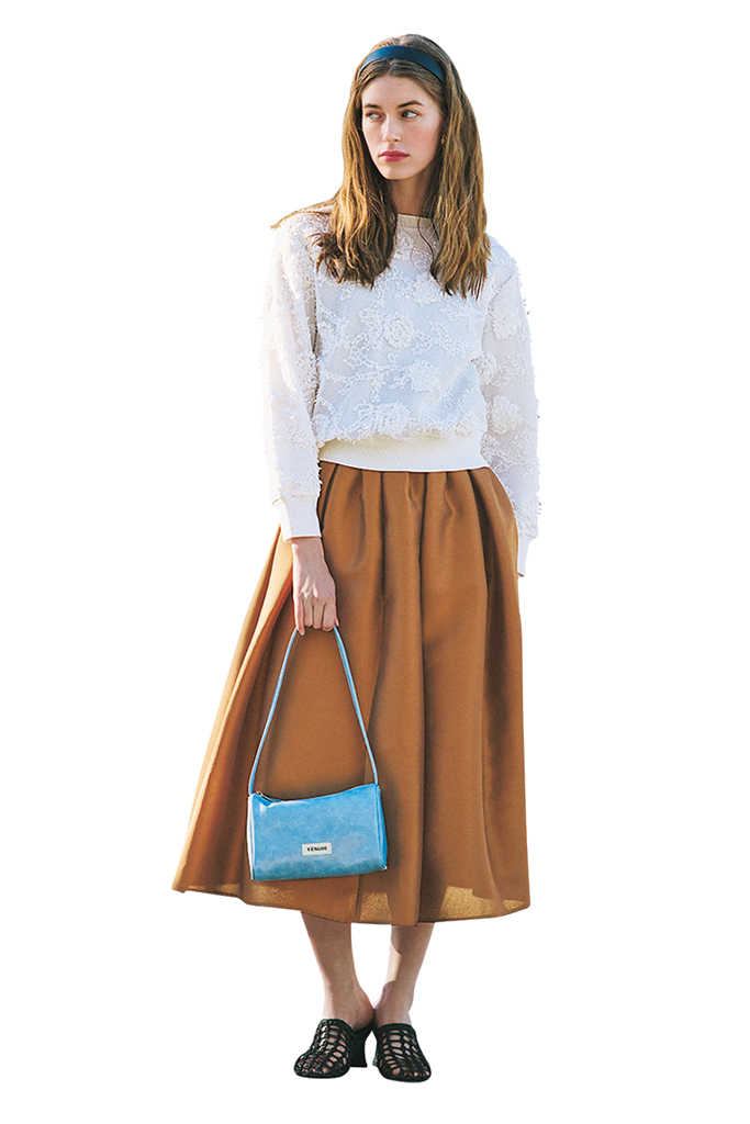 レースニット 26,950円/ユナイテッドアローズ(ユナイテッドアローズ 渋谷スクランブルスクエア店) ブラウンフレアスカート 44,000円/Sov.(フィルム) カチューシャ 3,300円/AKTE バッグ 9,130円/ヴェンディ、シューズ 37,400円/モリーニ(ともにジャック・オブ・オール・トレーズ プレスルーム) 全体にほどこされたチュールや、大小さまざまな花の刺しゅうが、白1色に奥行きを生む。ワイドなすそリブで、フレアとでも膨張見えは回避。