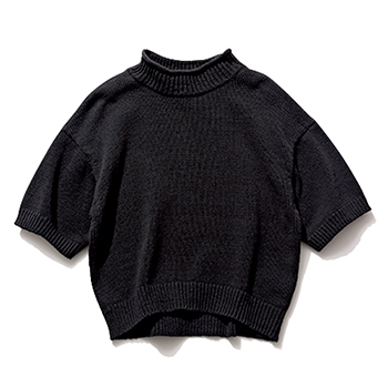 ブラックショートスリーブニット 20,900円/HER. 顔まわりをシャープに見せるハイネック。コンパクトなシルエットの黒と相まってモードな装いが即完成。