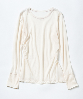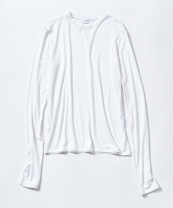 白ロングスリーブトップス 9,350円/emmi(エミ ニュウマン新宿店) 竹繊維を配合した至極のやわらかさで、ストレッチの効いた高い密着感ながら窮屈さはなし。そでも長め。