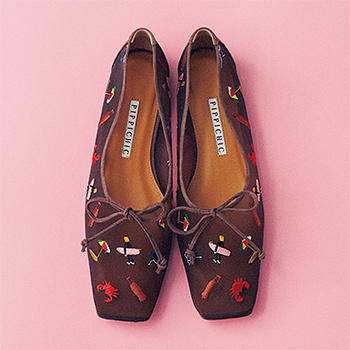 ブラウンメッシュバレエシューズ(1) 38,500円/PIPPICHIC(ベイジュ) 楽しげなバカンスムードの刺しゅうが目を引く1足。
