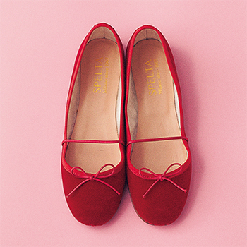 赤ベロアバレエシューズ(0.5) 37,400円/スペルタ(フラッパーズ) メリージェーン風のゴムベルトが、甲でしっかりフィット。