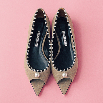パール×リネンシューズ(1) 40,700円/PIPPICHIC(ベイジュ) はき口のパール下にほどこされた黒のレザーラインが、スパイスに。