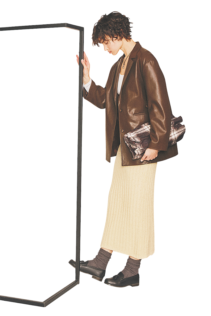 ブスカート 18,000円/バナナ・リパブリック ジャケット 35,200円/MANOF 中に着たカップつきカットソー 13,200円/LOEFF(エイチ ビューティー&ユース) ネックレス 6,160円/PETIT MOMENTS(ZUTTOHOLIC) バッグ 12,000円/COS(COS 青山店) ソックス 1,100円/靴下屋(タビオ) ローファー 12,980円/HARUTA タイトスカートのエッジを厚みでごまかしながらリブで縦を強調。