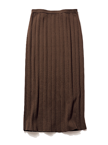 39,600円/デミー バイ デミリー フォー RHC(RHC ロンハーマン) 細かなプリーツのようなリブが、歩くたびにしなやかに揺れるハイゲージニット。ニット特有の柔らかな落ち感がありながら、広がりすぎない設計で腰まわりを華奢に見せてくれる。ブラウンの落ち着いた色味も手伝って、楽な着心地なのに、誰より品よく、スマートな佇まいに。