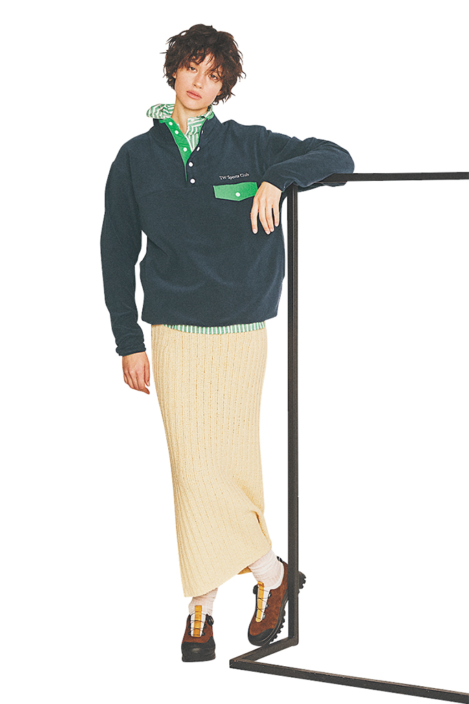 リブスカートははきまわし。フリース 24,200円/TW ストライプシャツ 9,990円/Gap ソックス 1,210円/靴下屋(タビオ) スニーカー 25,300円/PG×OSOI(ユナイテッドアローズ 渋谷スクランブルスクエア店) フリースとスニーカーのカジュアルさに、細身スカートで女性らしさをプラス。愛嬌のある太畝のリブニットなら、親しみやすさはそのまま。