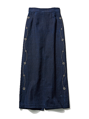 253,000円/ロンハーマン 脚のラインを拾いたくないなら、あえて硬さのあるリジッドデニムを。生地が自立するから、美しいシルエットをキープできる。サイドのシルバースタッズが視線を外側に流し、さらにスッキリとした印象に。背面のスリットで足さばきの良さも確保。両サイドの花モチーフのシルバースタッズで、モダンな切れ味が。背面に深めのスリット入り。