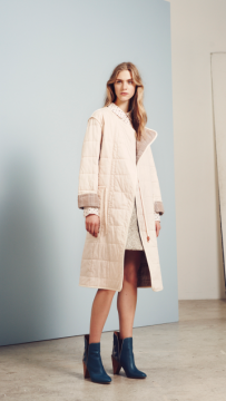 ノーカラーアウター、キルティングコートには、赤く染めたギャバジンコットンや、チェックのライナーが付いたブランケット、ブークレツイードなど女性らしい素材を使用しています。