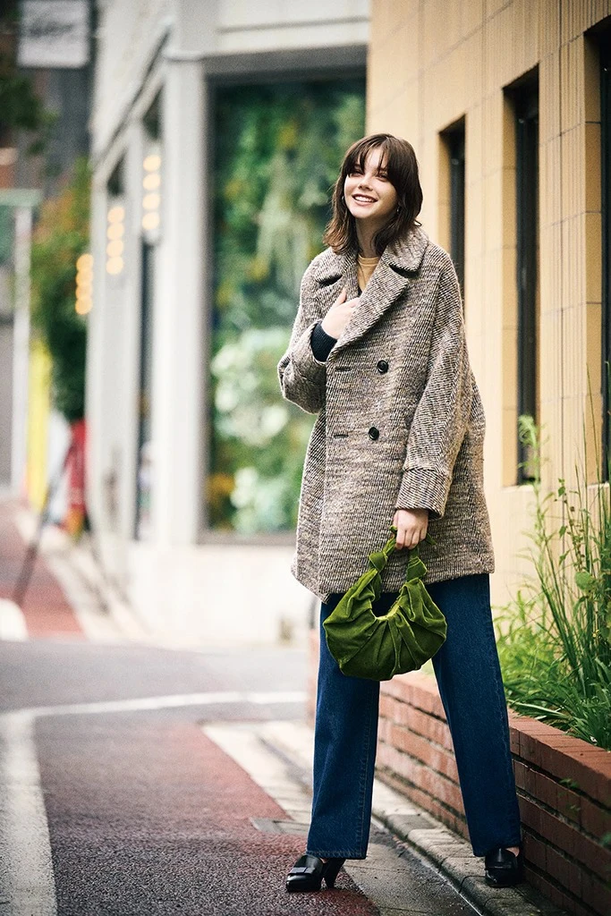 ミックスツイードコート 67,100円/TICCA(メゾン イエナ) グレーニット 28,600円/ベイジ,(オンワード樫山) ベージュTシャツ 12,100円/RH ヴィンテージ(ロンハーマン) デニムパンツ 27,500円/ホリデイ バッグ 38,500円/ブロンズエイジ(スティーブン アラン シンジュク) パンプス 61,600円/ネブローニ(ユナイテッドアローズ 渋谷スクランブルスクエア店)