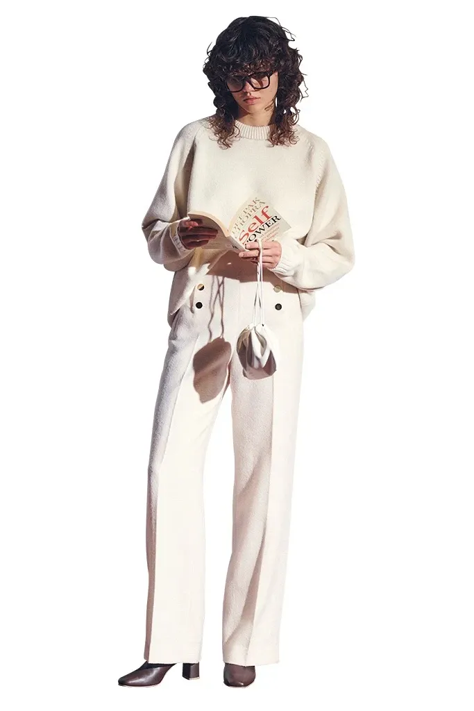 白パンツ 39,600円/BEIGE,(オンワード樫山 お客様相談室) 白ビッグニット(メンズ・青山店別注) 93,500円/ATON(ATON AOYAMA) 眼鏡 36,300円/バディオプティカル(ハウス バディオプティカル) ポーチ 39,600円/PORTO(ギャルリー・ヴィー 丸の内店) ショートブーツ 25,850円/ダイアナ(ダイアナ 銀座本店)
