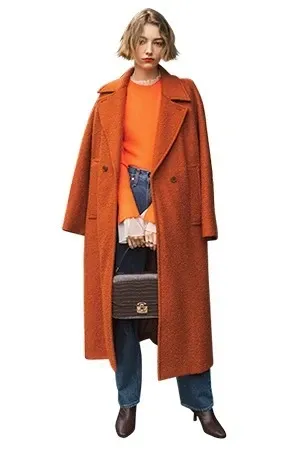 共布ベルトつきオレンジコート 22,000円/STYLEMIXER、バッグ 6,996円/MOUSSY(ともにバロックジャパンリミテッド) オレンジリブニット 14,300円/アダム エ ロペ 中に着た白チュールブラウス 11,000円/ユー バイ スピック&スパン(ユー バイ スピック&スパン ルミネ新宿店) デニムパンツ 13,200円/Levi’s®(リーバイ ・ストラウス ジャパン) ショートブーツ 14,850円/ル タロン(ル タロン プリュ 有楽町マルイ店)
